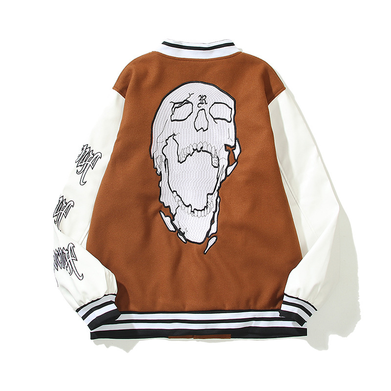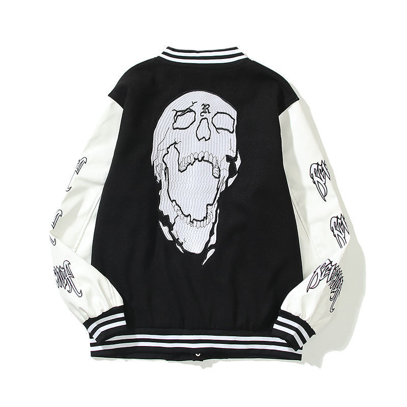 Elevate your style with this Men's and Women's Skull Embroidery Leather Sleeve Stitching Baseball Uniform Jacket that combines a classic sporty look with modern flair. Crafted from high-quality cotton, this jacket is both comfortable and durable, making it an ideal choice for everyday wear or special outings.